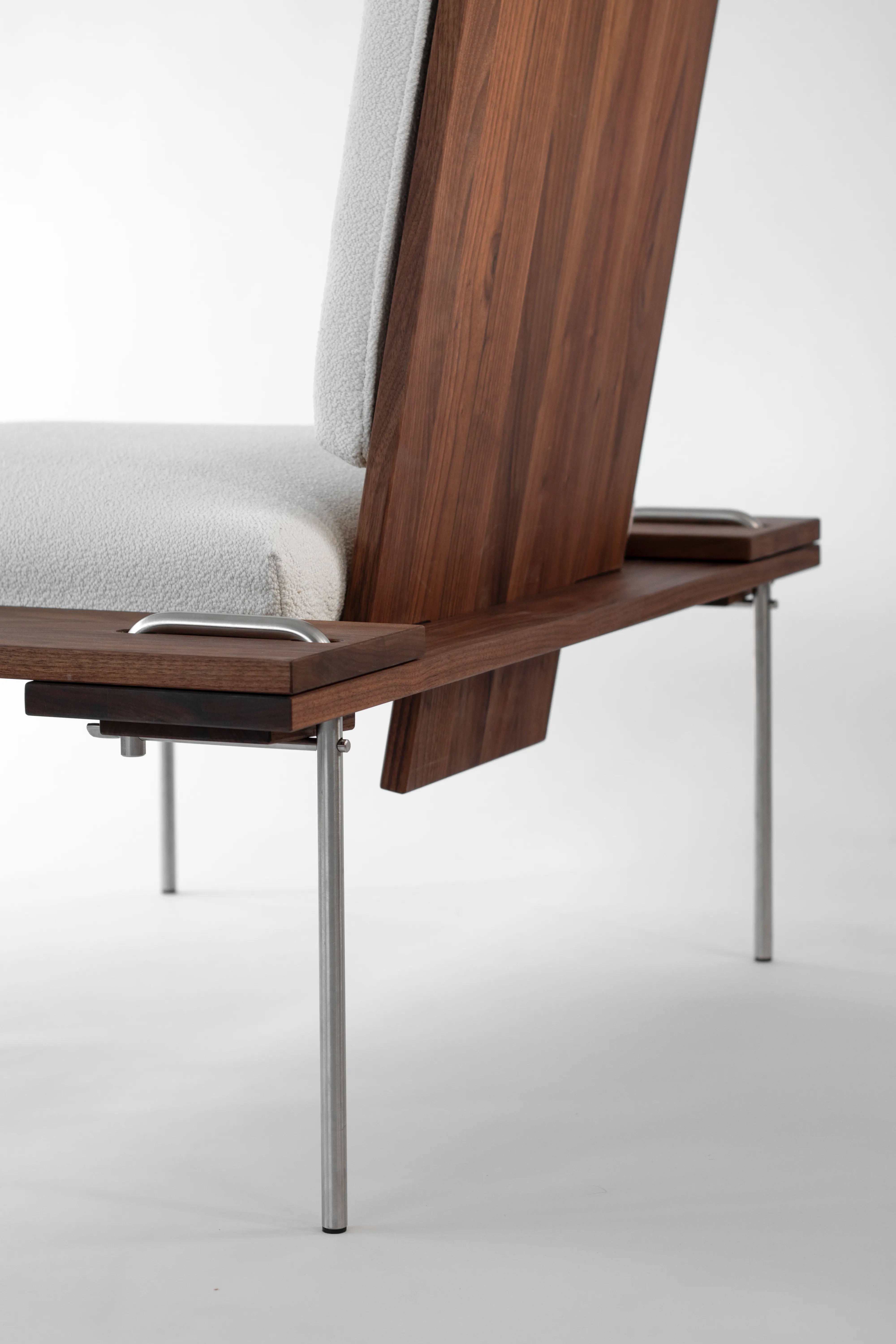 Die durchdachte Verbindung des Schneidersitzes versteckt sich elegant unter der "geschneiderten Naht" aus Metall. Flache Keile aus Massivholz verspannen an diesen Stellen die Sitzfläche mit den Stuhlbeinen. Dieses besondere Detail verbindet das traditionelle Handwerk mit modernem Design.